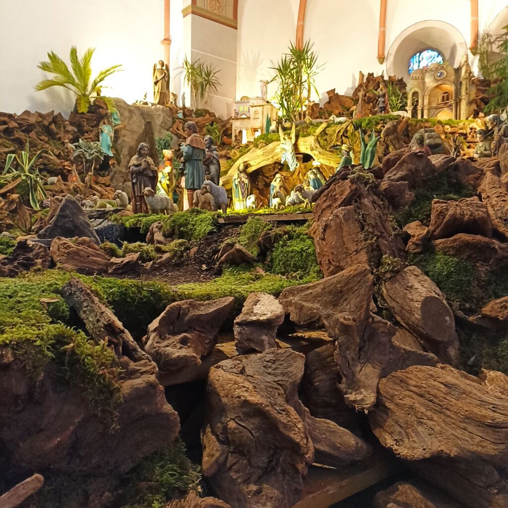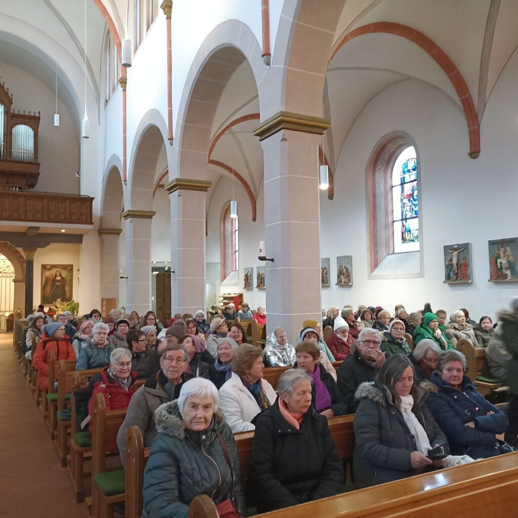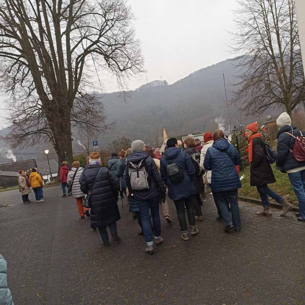 Da die Fahrt länger als üblich dauerte, starteten wir dort angekommen direkt mit einem leckeren Mittagessen. Auch das mussten wir aus Kapazitätsgründen in zwei Lokale einnehmen. Nach dem Mittagessen besichtigten wir in der Katholischen Kirche Maria Himmelfahrt die außergewöhnliche Naturwurzelkrippe, angeregt von Gustel Hertling. Diese ist mit einer Grundfläche von 92 Quadratmetern und einer Höhe von 7,50 Metern die größte Naturwurzelkrippe der Welt! Sie besteht aus 1000 zusammengesteckten Wurzeln, die jedes Jahr wie ein Tetris-Spiel aufs Neue zusammengesetzt werden müssen. Auf ihr sieht man 40 Figuren, 85 Tiere, natürlich eine Krippe, viele Pflanzen und einen Wasserfall. Wir waren sprachlos über diese großartige Krippe. Mit den Stimmen von 150 Frauenbundfrauen wurde das Weihnachtslied „Oh du Fröhliche“ gesungen: Gänsehaut-Feeling pur! Danach wurde die große Gruppe aufgeteilt, wobei wir in Kleingruppen auf einem Rundgang viel über ganz unterschiedliche Krippen, die Ideenfindung und den Initiator dieses außergewöhnlichen Ortes erfahren konnten. Natürlich blieb auch noch Zeit genug, um auf eigene Faust Waldbreitbach zu erkunden, oder sich bei einer Tasse Kaffee oder Glühwein und mit einem Stück Kuchen etwas aufzuwärmen. Um 18.00 Uhr trennten sich unsere Wege wieder, um nach Hause zu fahren.