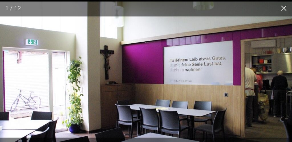 In diesem Jahr trafen wir uns in der Vesperstube des Katholischen Sozialzentrums in Viernheim. Eigentümer und Träger des Sozialzentrums ist die Pfarrei Hl. Johannes XXIII. in Viernheim. Nach einer kurzen Begrüßung führte Gemeindereferent Herbert Kohl die Anwesenden durch das gesamte Anwesen und erklärte die einzelnen Gruppierungen, die insgesamt das Sozialzentrum bilden. Dies sind u.a. die Viernheimer Tafel, der Kinderkleiderladen „Jacke wie Hose“, die Kleiderkammer der AWO, der „Laden mit Herz“ für Haushaltswaren, die Radwerkstatt „Makerspace“, usw., sowie die Vesperstube. In dieser wird jeden Freitag von Frauen des KDFB ZV Viernheim eine warme Mahlzeit für ca. 60 Gäste unter der Leitung von Inge Adler, die bis vor 2 Jahren dem Diözesanvorstand angehörte, gekocht.