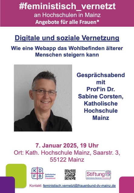 An diesem Abend berichtet Prof’in Dr. Sabine Corsten von der Katholische Hochschule Mainz über ihr Forschungsprojekt BASE-TALK (www.basetalk.de). Sie wird technik-basierte Ansätze vorstellen, die die soziale Vernetzung mit älteren Menschen in ähnlichen Situationen stimulieren und zum Austausch von Lebensgeschichten im Alter anregen können. Durch diese Ansätze wird das psychische Wohlbefinden gesteigert und depressiven Symptomen kann vorgebeugt werden. Wesentliches Element für diese Arbeit ist die Webapp BaSeTaLK (https://www.basetalk.de/), die von Sabine Corsten und ihrem Team entwickelt wurde und zur Anregung von Biographiearbeit in Senioreneinrichtungen eingesetzt werden kann. Neben der Vorstellung quantitativer Daten wird an dem Abend insbesondere auf die Perspektive der Nutzenden in den Blick genommen.
