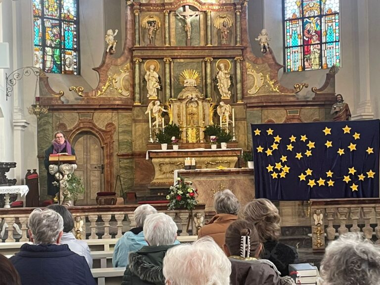 Mit einem schön gestalteten Gottesdienst, vorbereitet in Zusammenarbeit mit Christina Feifer, der geistlichen Beirätin des Diözesanverbandes Mainz und dem Vorstandsteam, begann der Jubiläumstag in der Abenheimer Kirche. Dieser besondere Tag stand unter dem Motto „60 Jahre Sternstunden KDFB Abenheim“; dieses Motto zog sich wie ein roter Faden durch das Programm. Bereits weit im Vorfeld wurden Mitglieder nach ihren persönlichen Sternstunden innerhalb des Zweigvereins befragt. Diese Aussagen machte dem Vorstandsteam bewusst, wie wertvoll die Arbeit des Vereins für die einzelnen Frauen und die Gemeinschaft ist.